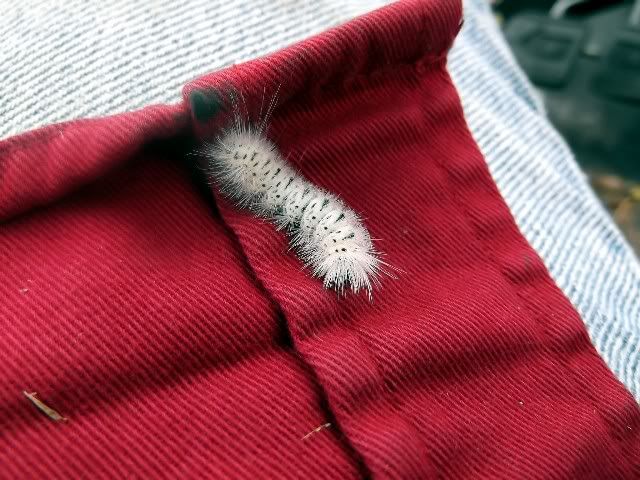 The 'bugs' haven't found me very attractive this summer. I'm thinkin the heat and drought has somethin to do with it. I figger I'm just as attractive to the bugs as I have been. This past week, I looked down and saw this fuzzy guy on my shirt. Have no idea what it is. Had my first lady bug land on me this week, too.