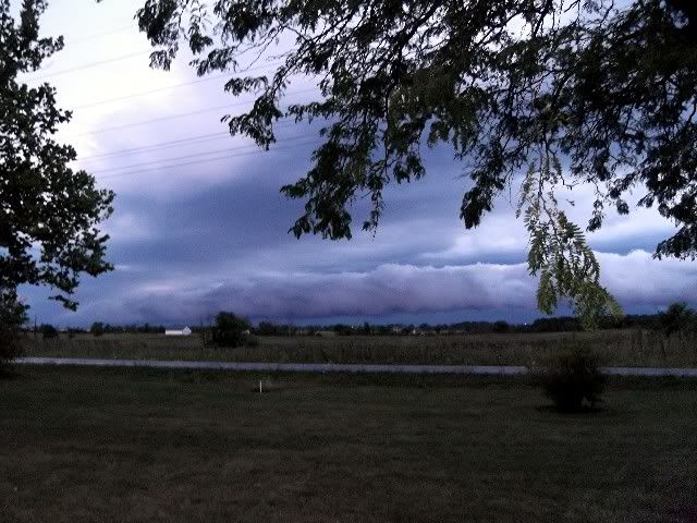 The week before last, early morning stormed passed by. Only got about .20" of rain out of it. Hardly enough to stop mowin, but since there was some lightning, I came in till it stopped. What I believe to be a roll cloud formed and move almost directly south. Everything has to be just right for a roll cloud to form. It was movin southeast and never did pass over where I was. A roll cloud is formed by the downdraft of a decaying thunderstorm. The outflow from the dissipating storm spreads outward and lifts the warm and moist air still at the surface. It wasn't really connected to the higher clouds. One does not see roll clouds very often. The storm cell was definitely dissipating according to radar.