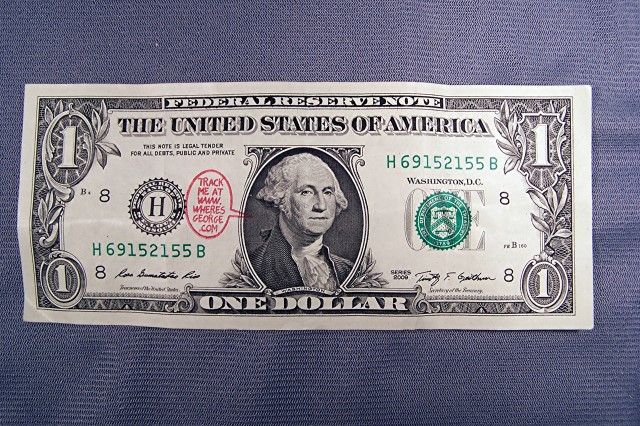 A dollar bill stamped 'Where's George." I always post it on the Where's George tracking site. I get them 2 or 3 times a year. I was disapointed that they remodeled their site and trashed all my previous posts. Oh, well . . .
