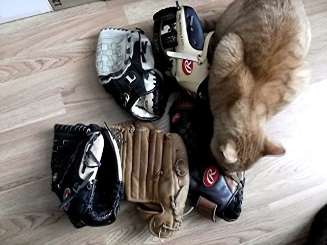 I've picked up 5 ball gloves during the past couple weeks. I found three at the local Goodwill today. I laid them out for a pic and Simon appears from who knows where to inspect them. He likes to inspect everything I bring home for eBay. Maybe I should print up some tags that say "Inspected By Simon" and staple them to the invoice.